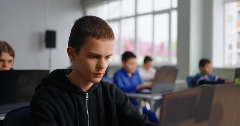 Computer Based Classroom In Modern School, Boy Playing On Computer, Games And Web Design Pro Video