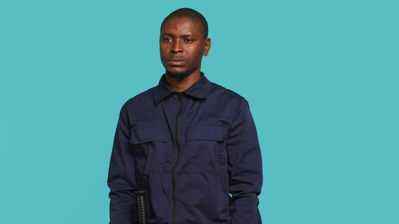 Portrait of smiling security agent securing assigned post, isolated against studio background. African american guardian prepared to handle security breaches and diffuse tense situations, camera A Pro Video