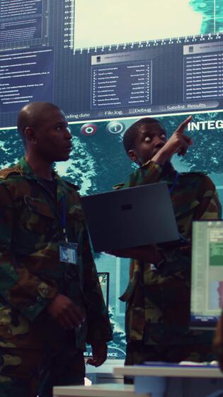 Vertical Signal support systems specialists work with battlefield data and terminal devices in military command post. Reconnaissance operators targeting enemy warships on CCTV radar. Camera B. Pro Video