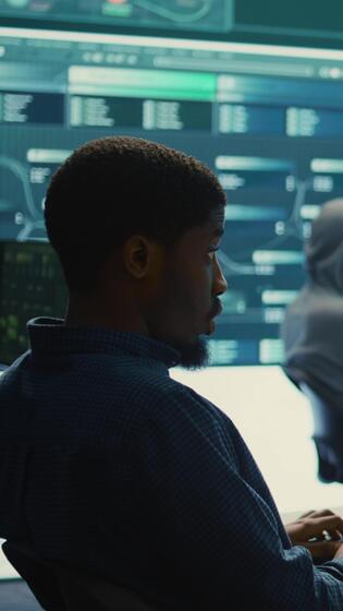 Vertical Governmental hackers working together on digital security and cyber defense measures. Engaging in cyber operations, network security and data protection during information war. Camera B. Pro Video