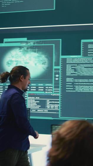 Vertical Governmental hackers using advanced software to protect against cyber threats, working in team. Specialists on cyber security, data and network protection unite forces in high tech office. Camera B. Pro Video