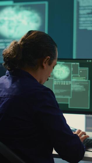 Vertical Governmental IT expert monitoring cyber threats on a computer and big screen, high tech agency office. Hackers examining cyber defense measures for prevention of dangerous digital threats. Camera B. Pro Video