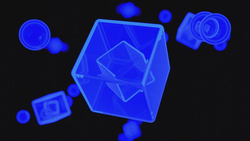 Black background with three-dimensional squares. Design. Small squares of blue shades rapidly rotating around themselves in abstraction. Pro Video