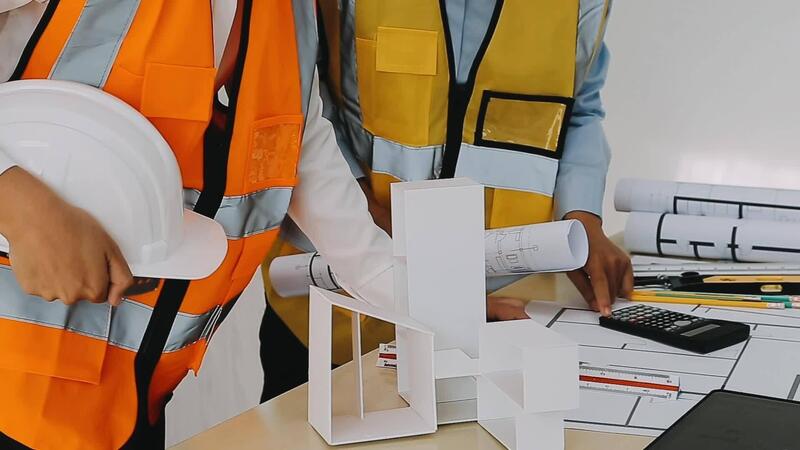 Construction and structure concept of engineer working drawing on blueprint meeting for project working with partner on model building and engineering tools in working site, construction concept Free Video