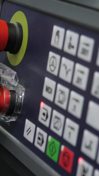Close-up pressing buttons of machine control panel. Media. Starting production machine using control panel. Panel with button for controlling production machines Pro Video