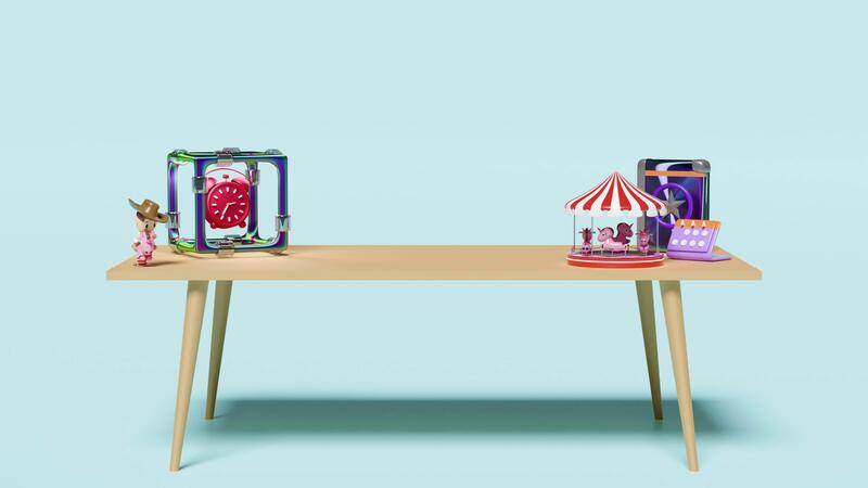 3d desk in office with toy, book, calendar, alarm clock isolated on blue background. table abstract background. 3d render illustration Free Video