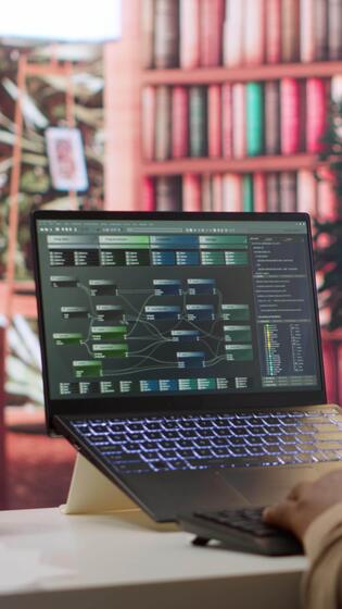 Vertical AI software engineer coding modern innovative development project on his gadgets, showcasing machine learning and data processing on neural network. Artificial intelligence business. Camera A. Pro Video