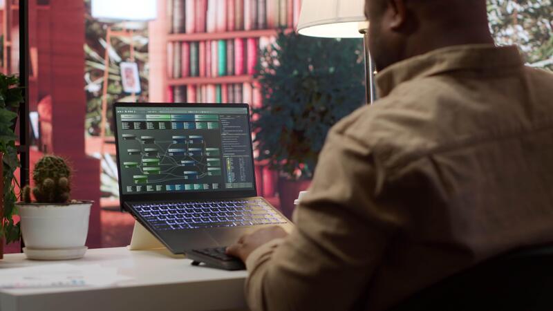 AI software engineer coding modern innovative development project on his gadgets, showcasing machine learning and data processing on neural network. Artificial intelligence business. Camera A. Pro Video