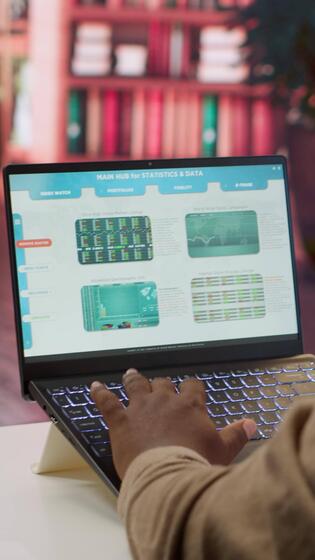 Vertical Entrepreneur calculating expenses with online invoices on laptop, creating an analytics reports plan for investment strategy. Working on increasing budget for business expansion. Camera A. Pro Video