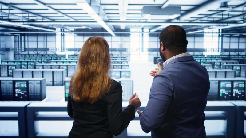 Teamworking admin colleagues inspecting server room hardware. IT expert and colleague supervising data center establishment, checking equipment, monitoring performance, camera B Pro Video
