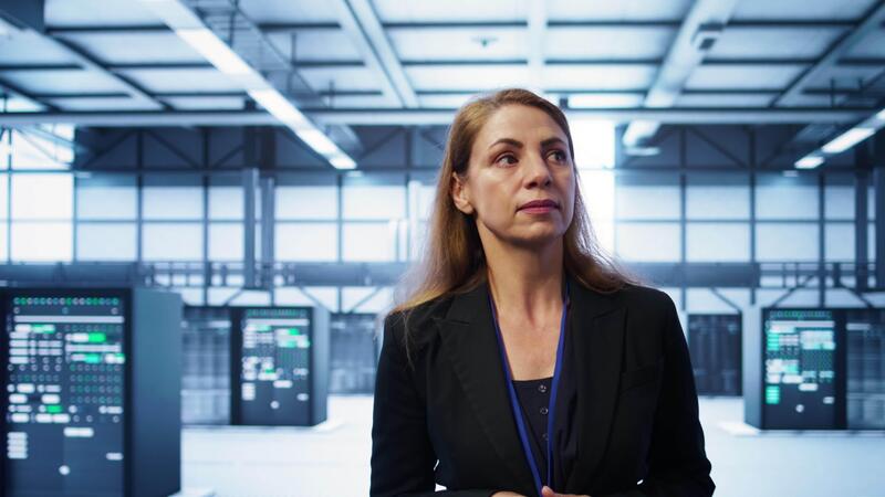 Manager inspecting server room equipment, walking between supercomputers. Supervisor doing evaluation of data center location, checking equipment, monitoring performance, camera B Pro Video
