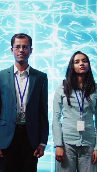Vertical Admins using artificial intelligence computing simulating human brain thought processes in computerized model. Portrait of employees working with AI machine learning algorithms, camera B Pro Video