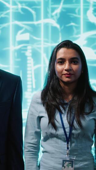 Vertical Portrait of smiling team of technicians implementing artificial intelligence parallel processing, breaking up complex computational tasks enabling AI systems to process data faster, camera A Pro Video
