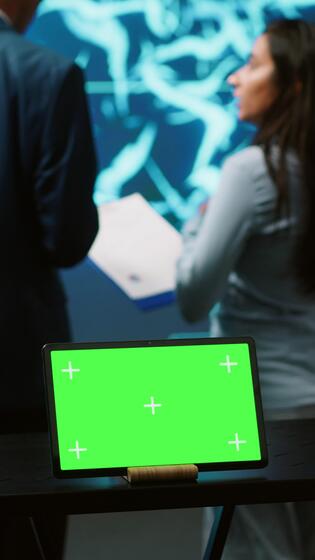 Vertical AI programmers colleagues using green screen laptop for business data analysis. IT experts in high tech location work on chroma key notebook to automatize tasks using artificial intelligence, camera A Pro Video