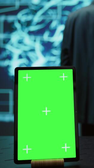 Vertical Green screen tablet used by computer scientists in startup doing advancements in AI field. Employees working on mockup device in workspace featuring artificial intelligence systems, camera B Pro Video
