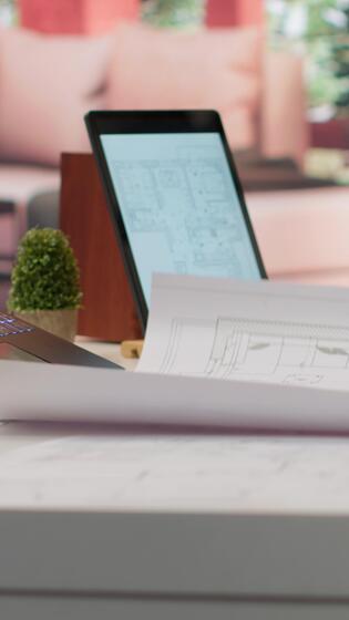 Vertical Owner of a tech startup searching for new office spaces by using blueprints to plan the construction and renovation of the corporate building. Evaluating and reviewing workplace drafts. Camera A. Pro Video