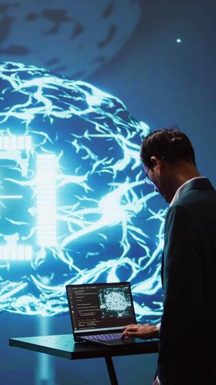 Vertical System administrator uses neural networks modeled after human brain to solve complex problems. AI researcher in futuristic workspace using artificial intelligence to look at data, camera B Pro Video
