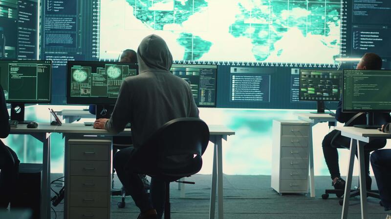 Cyber operations center with governmental hackers working on digital security activities during hybrid war. Specialists team ensuring security and malware detection, cyber surveillance. Camera A. Pro Video
