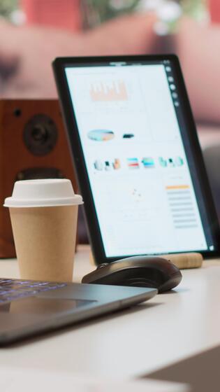 Vertical Empty business entrepreneur office setup at home with personal computer and documents showing financial data for startup development. Remote work planning for enterprise growth. Pro Video