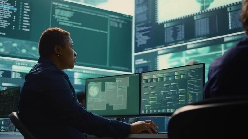 Cyber security expert working on encryption and IT security in a governmental agency. Woman engaging on cyber operations, network security and data protection for hybrid war. Camera B. Pro Video