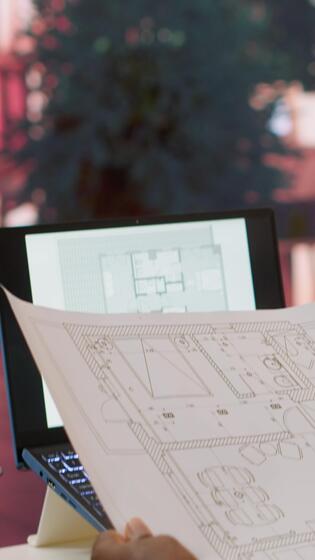 Vertical Business owner conducting strategic research on office spaces and building layouts, using blueprints and sketches to draft and organize a new creative workspace. Office hunt relocation. Camera A. Pro Video