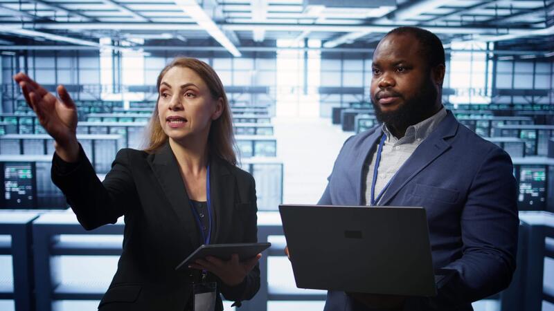 Teamworking colleagues doing checkup, inputting data on laptop of needed server hub fixes. Coworkers working together in data center housing advanced storage infrastructure, camera B Pro Video