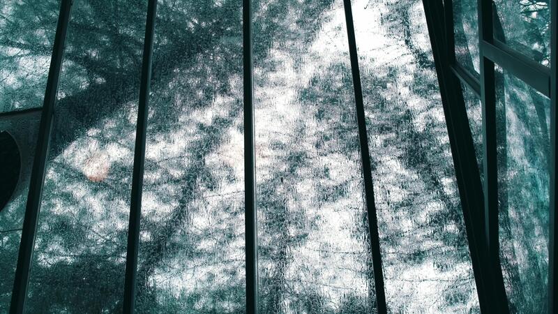 Abstract view through a glass ceiling with a geometric frame structure, showcasing a patterned and textured perspective of trees and sky Pro Video