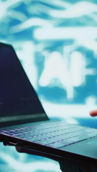 Vertical Engineer using notebook to maintenance artificial intelligence neural networks. Close up shot of IT expert using AI system aiding in processing and transmitting information, camera B Pro Video