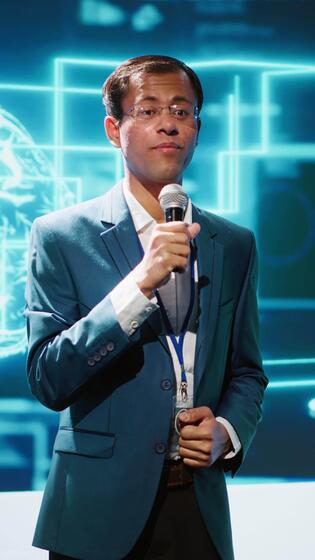 Vertical Presenter talking with spectators at AI convention bringing together IT specialists, sharing insights from latest developments in artificial intelligence and cognitive computing, camera A Pro Video