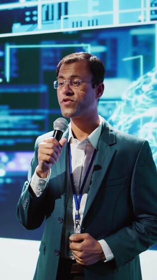 Vertical Presenter talking with spectators at AI convention bringing together IT specialists, sharing insights from latest developments in artificial intelligence and cognitive computing, camera B Pro Video