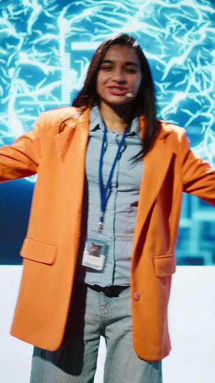 Vertical Lively speaker talks at AI event gathering tech startups managers, investors and academics. Expert hosts sessions geared towards helping IT business leaders tap into artificial intelligence, camera A Pro Video
