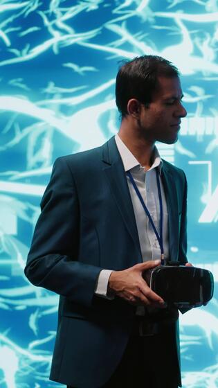 Vertical Engineers use VR smart goggles and AI neural networks to solve company problems. IT experts using artificial intelligence and AR virtual reality tech to visualize startup business data, camera A Pro Video