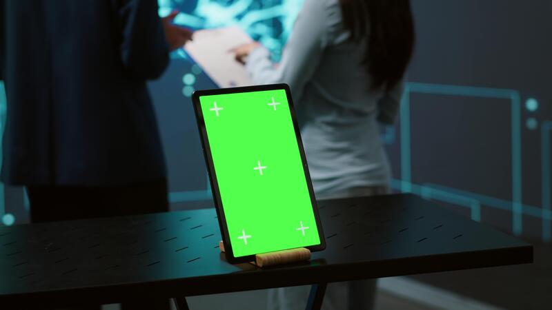 Green screen tablet used by computer scientists in startup doing advancements in AI field. Employees working on mockup device in workspace featuring artificial intelligence systems, camera A Pro Video