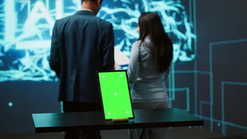 Engineers use green screen tablet and AI neural networks modeled after human brain to solve complex problems. Workers using artificial intelligence and mockup device to look at company data, camera A Pro Video