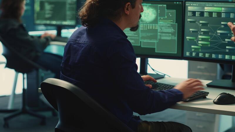 Cyber security experts in a governmental hacking room working on securing networks. Hackers focusing on malware detection, cyber operations and protection against digital mercenaries. Camera A. Pro Video