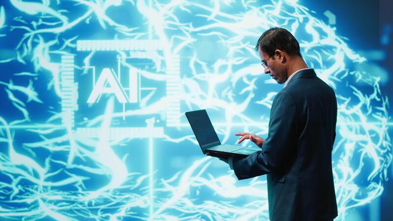 System administrator working on laptop, programming artificial intelligence computing simulating human brain. Man in workspace using notebook, building AI machine learning algorithms, camera A Pro Video