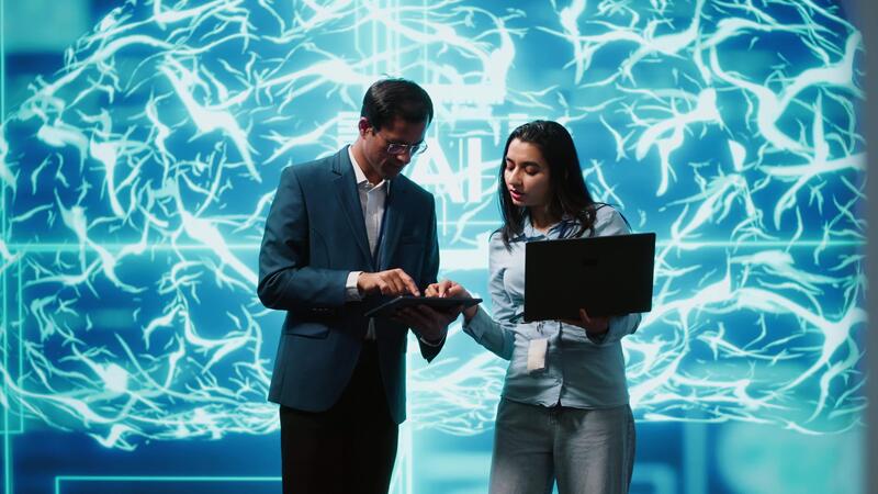 Teamworking colleagues using AI neural networks modeled after human brain to solve complex problems. Team of IT specialists using deep learning to look at data and complete tasks, camera A Pro Video