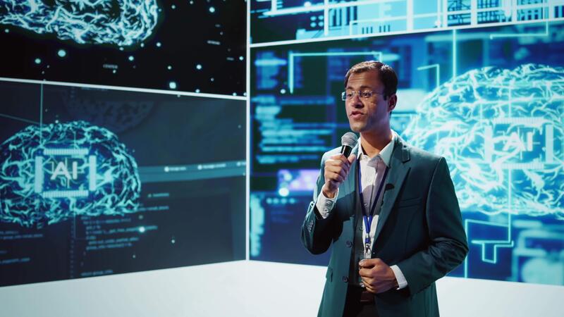Presenter talking with spectators at AI convention bringing together IT specialists, sharing insights from latest developments in artificial intelligence and cognitive computing, camera B Pro Video