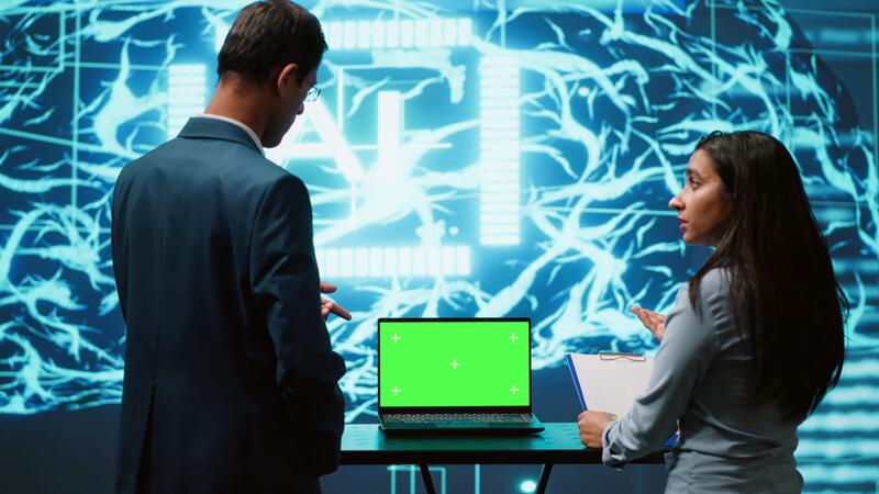 Startup coworkers looking over charts, using AI software on mockup laptop to take data driven decisions. Teamworking colleagues developing artificial intelligence solutions for company, camera A Pro Video
