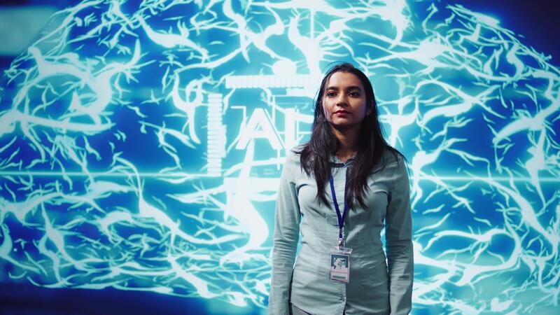 Portrait of smiling IT specialist standing with arms crossed in front of cutting edge display featuring AI and neural network graphics. Researcher in startup doing advancements in AI field, camera B Pro Video