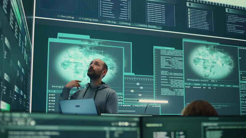 Governmental hacker examines info on a big screen in agency office, using advanced technology to secure computer networks. Working on cyber security and defending against cyberwarfare. Camera B. Pro Video