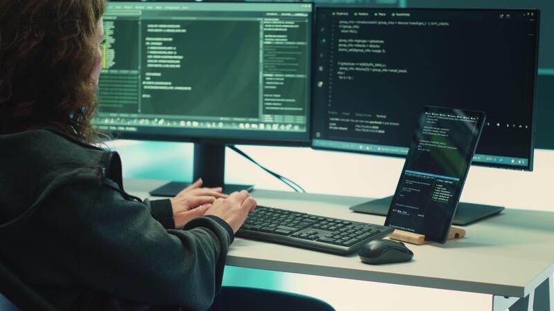 Cyber intelligence team using advanced technology to secure computer networks, governmental espionage system. Emphasizing cyber security and threat detection to combat cyberterrorism. Camera A. Pro Video