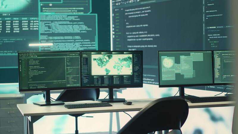 Empty cyber operations center for governmental hacking and threat detection. Equipped with technology for monitoring cyber threats, cybercrime, and safeguarding digital information. Camera A. Pro Video