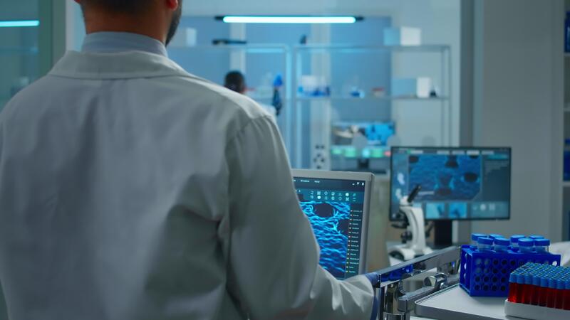 Scientist working in laboratory analysing test trial vaccine checking drug data standing in front of pc. Group of chemists examining virus evolution using high tech for research diagnosis Pro Video