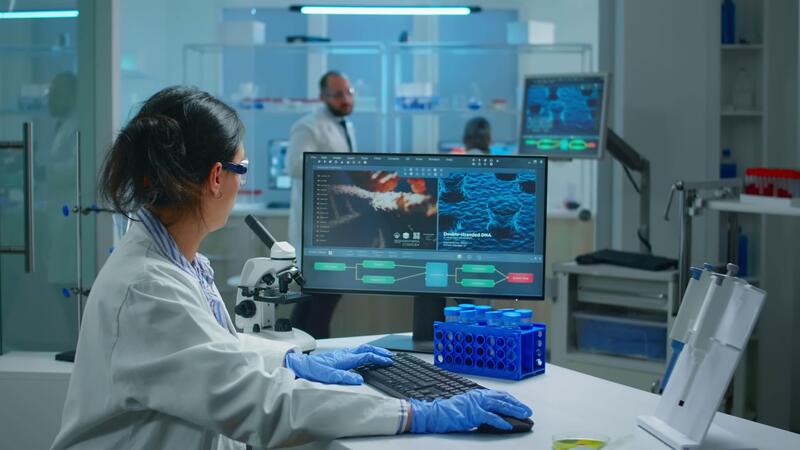 Group of scientists wearing lab coat working in laboratory while examining biochemistry sample in test tube and scientific instruments. Science technology research and development study concept Pro Video