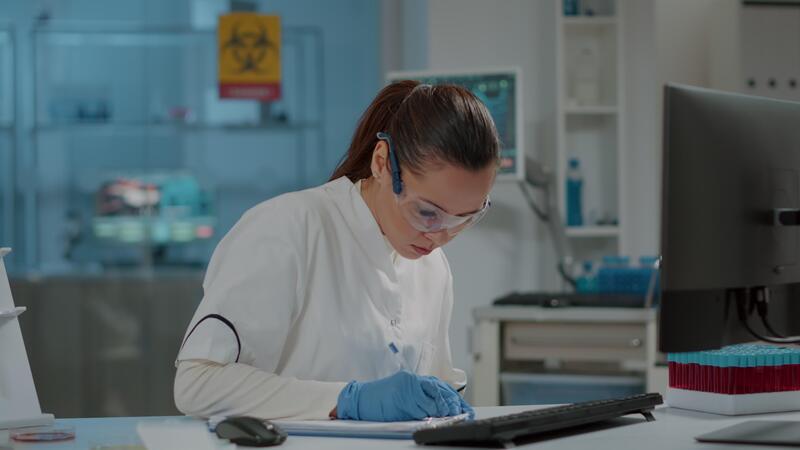 Woman chemist taking notes for science research in laboratory, working on development. Scientist using computer in lab to work on experiment and write on paper for biology expertise. Pro Video