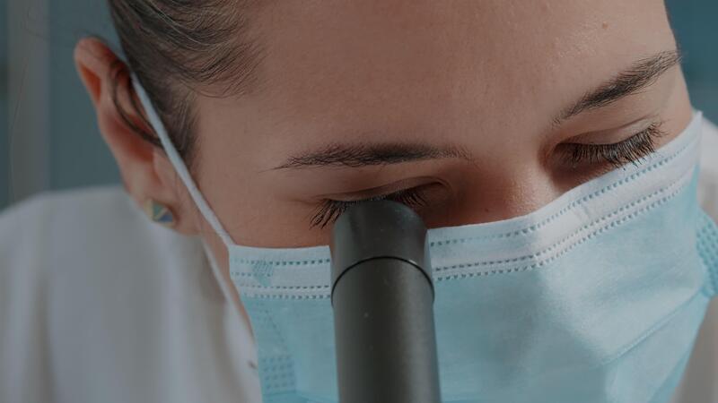 Woman scientist using microscope with magnifying glass for science experiment in laboratory. Specialist wearing face mask, working with microscopic lens on scientific tool. Close up Pro Video