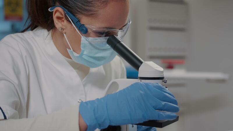 Biologist with face mask using microscope in science laboratory, analyzing dna sample and substance with microscopic tool. Woman with protective glasses working with magnifying glass lens Pro Video