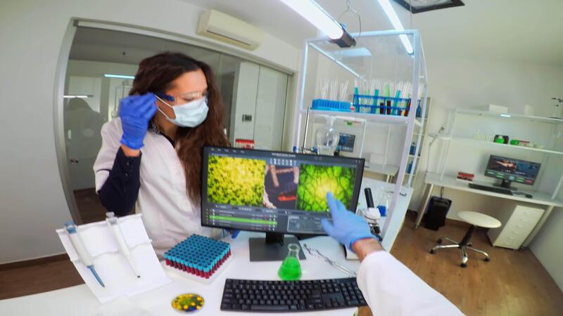 POV of laboratory medical stuff disscussing about vaccine development holding chemical container with green sample. Scientist working with DNA scan image in modern equipped laboratory using high tech Pro Video