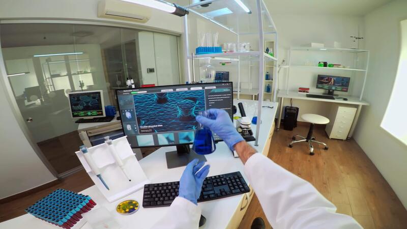 POV of medical scientist working with DNA scan image in modern equipped lab holding test tube with sample. Team examining vaccine evolution using high tech and chemistry tools for vaccine development Pro Video
